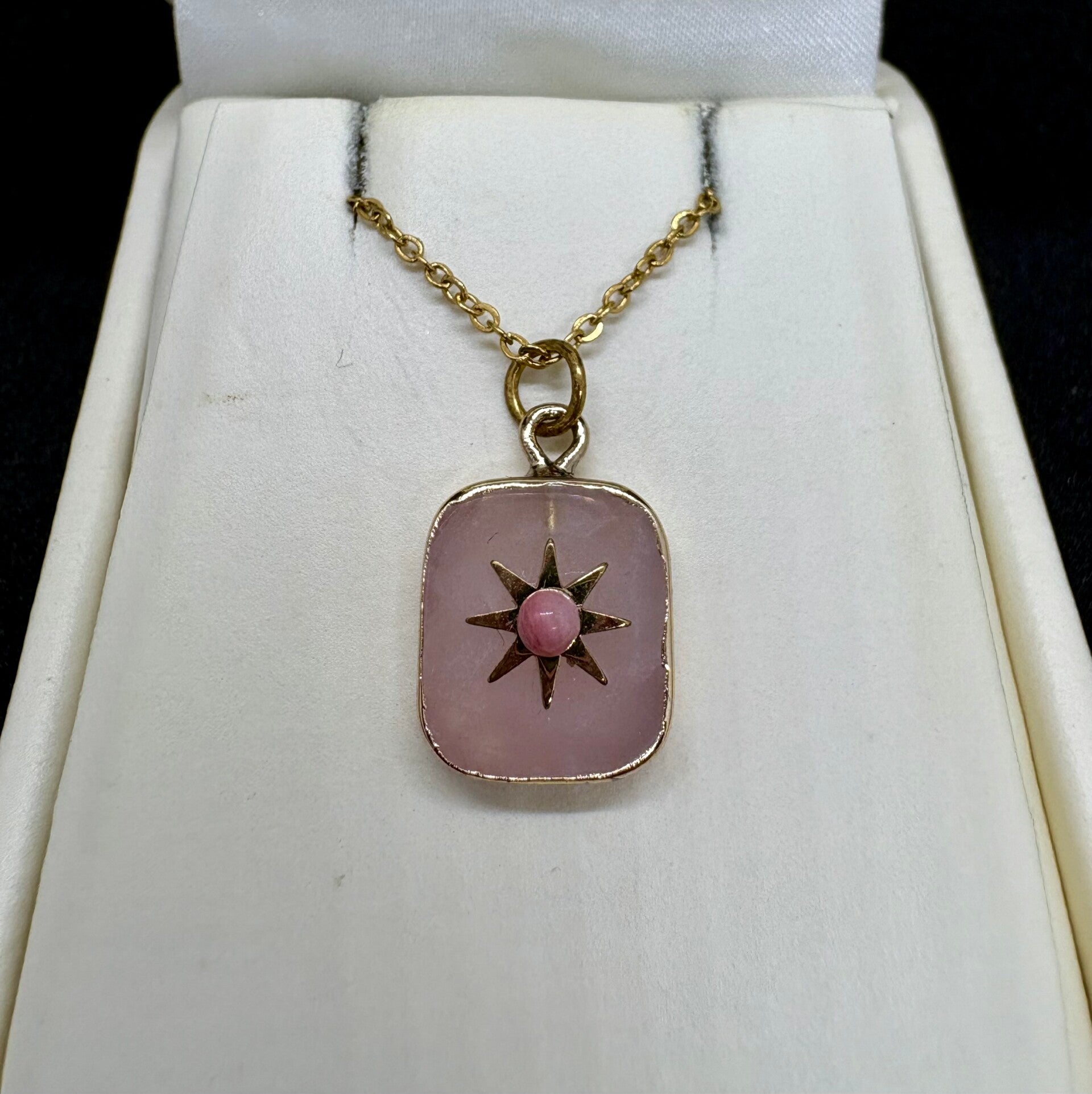 Magnifique collier en acier inoxydable de très haute qualité et pendentif en quartz rose.